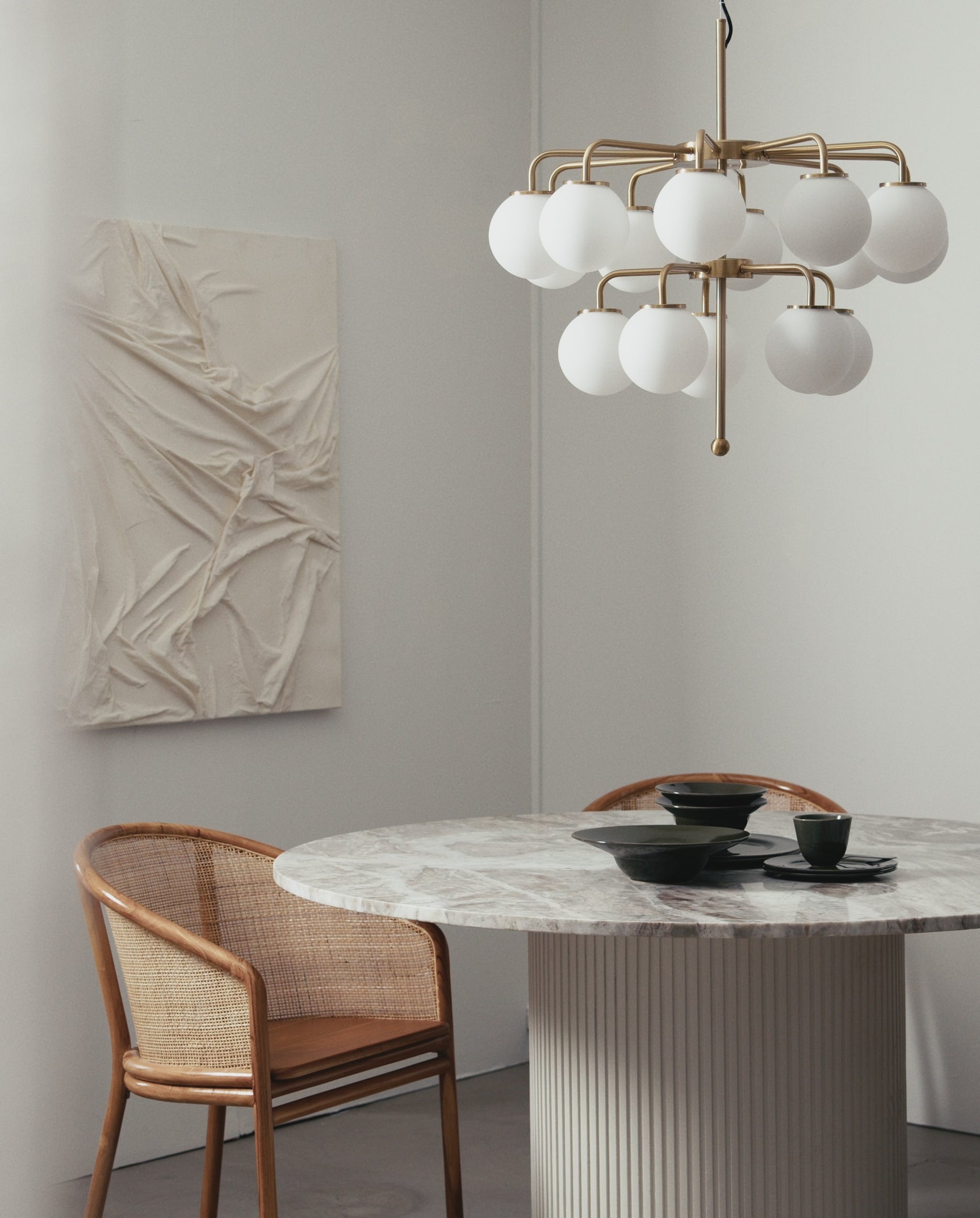 PALMA lysekrone er laget av messingfarget metall og runde hvite glaskupler. De 15 utformede glaskupler sprer et mykt og innbydende lys som skaper en atmosfære av raffinement og stil. Uansett om det er over et spisebord, i en stue eller et foyerområde, vil PALMA lysekrone tilføre et preg av tidløs eleganse til hjemmet ditt.