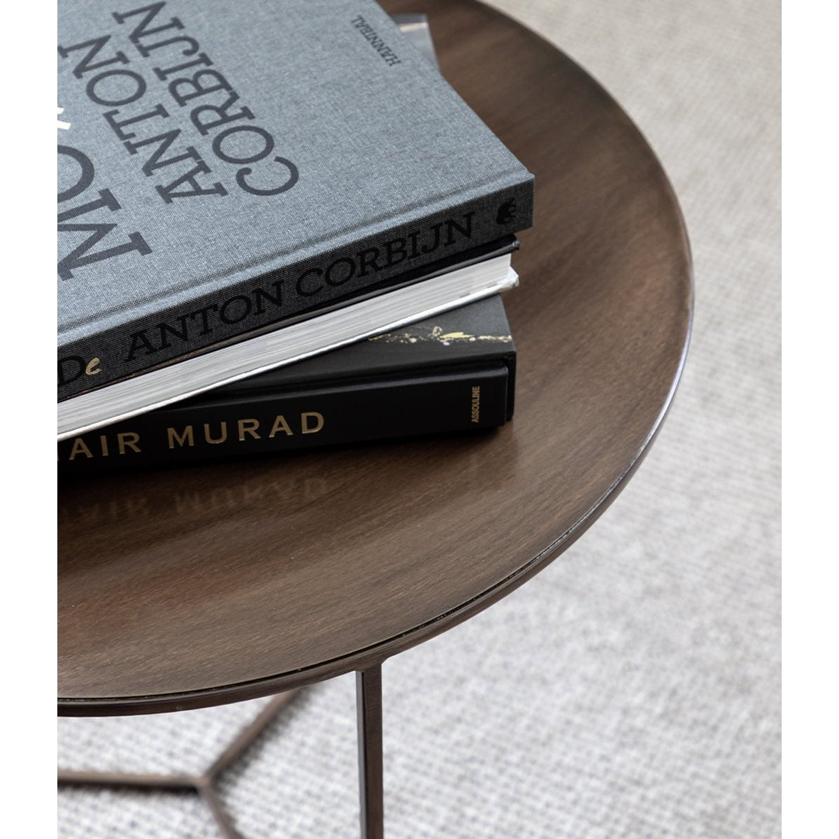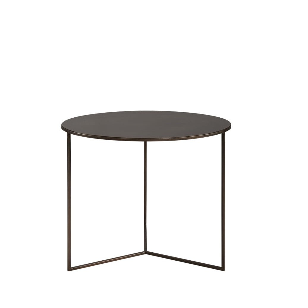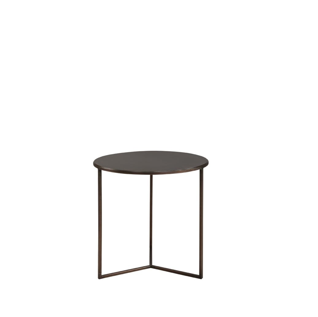 Sidebord i stål bronse. Hver del er unik. Overflaten er følsom for væskesøl, og dette bør tørkes opp umiddelbart for å unngå å skade overflatelaget. Unngå kontakt med varme overflater og bruk matter for kopper, glass, vaser osv. Rengjør kun med en fuktig klut og ikke bruk sterke rengjøringsmidler. Anbefales for innendørs bruk.