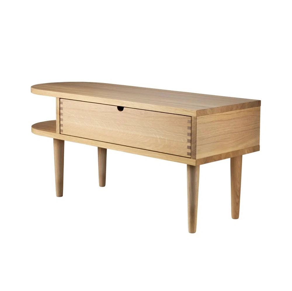 F24 bænken, designet av Mot & Bergstrøm, er et funksjonelt og stilrent møbel som passer perfekt i små leiligheter, på barnerommet eller i dagligstuen. Laget i massiv eik, kombinerer denne bænken flere bruksområder i ett – den fungerer både som en sitteplass og et lite bord med en praktisk skuffe for oppbevaring.