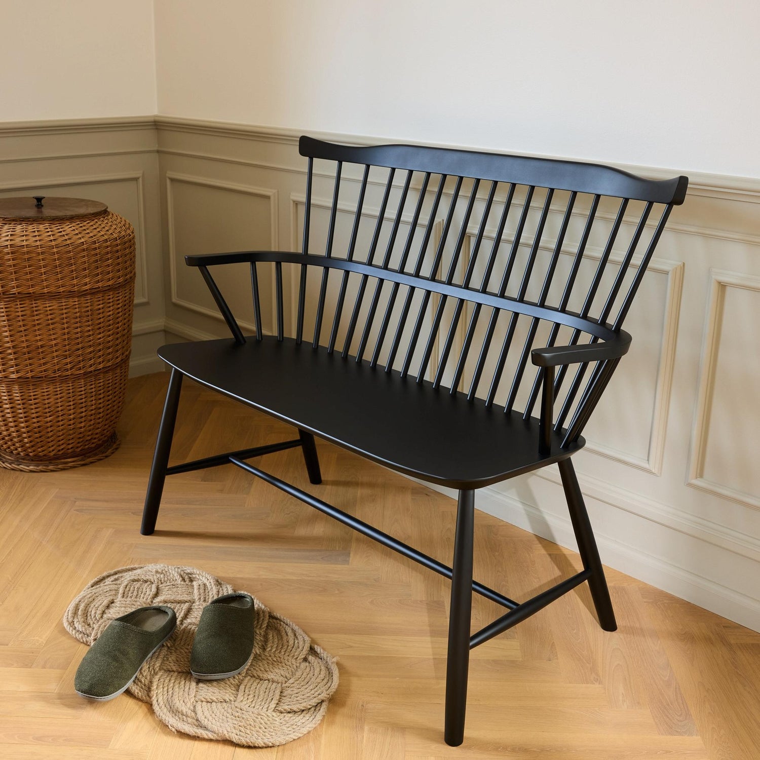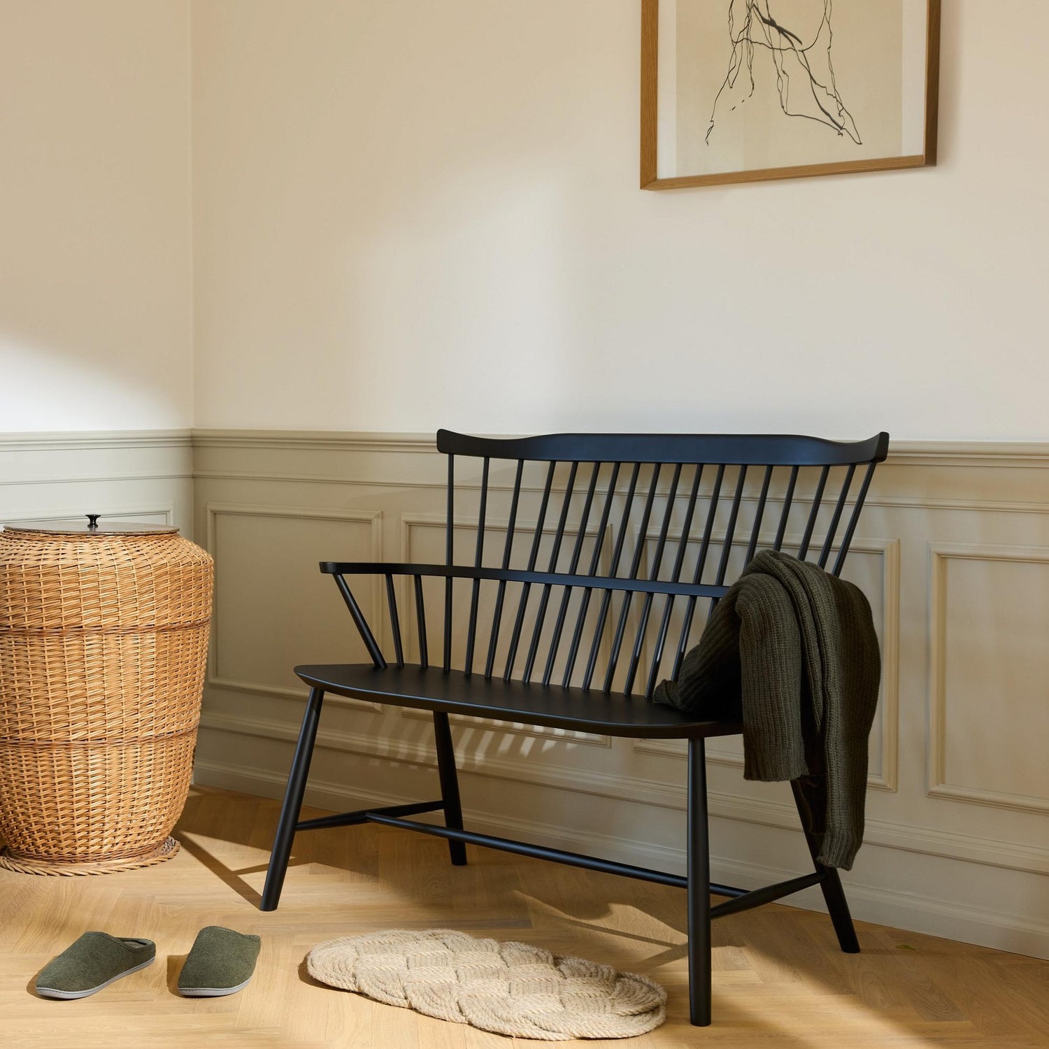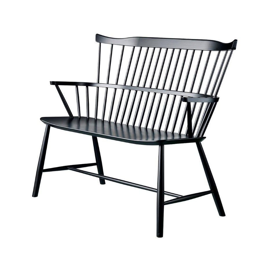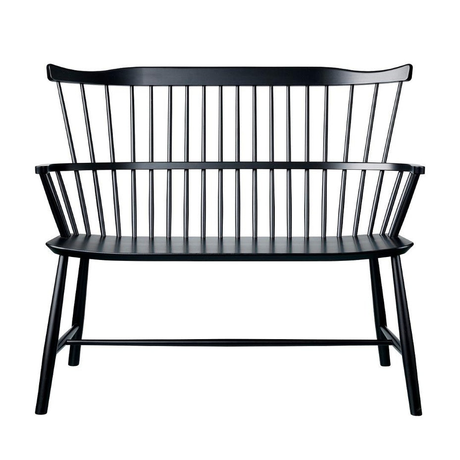Børge Mogensens J52D-benk bygger på den komfortable Windsor-stolen J52B, som raskt ble en klassiker etter lanseringen i 1952. Benken bevarer stolens moderne, harmoniske og luftige design, med den karakteristiske buede ryggstøtten. Samtidig tilbyr J52D en komfortabel sitteplass for to – enten rundt spisebordet eller som et frittstående møbel i hjemmet.